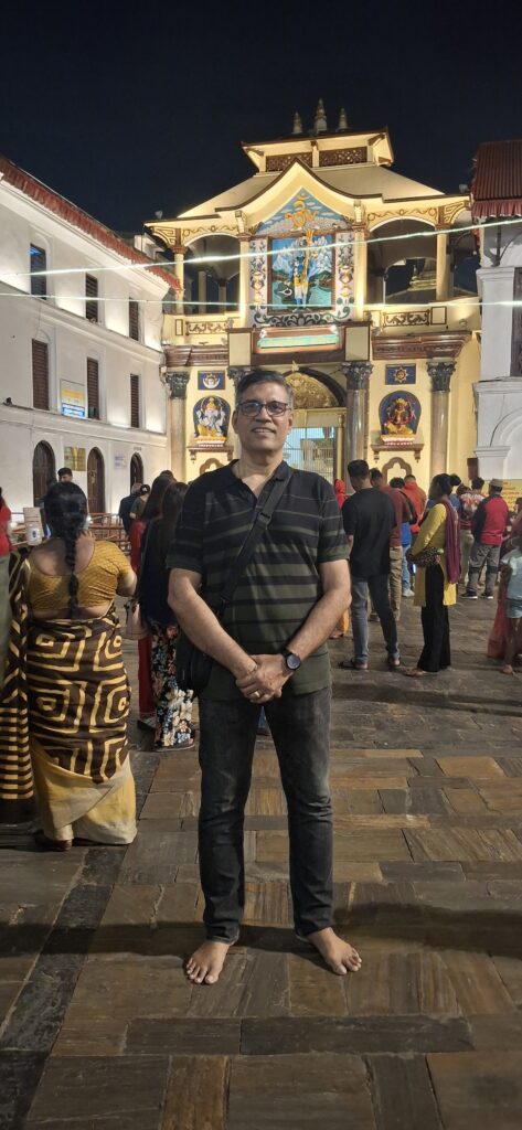 Pashupatinath temple is among the Char Dham shrines of Nepal. The temple houses a unique four-faced Shiva Lingam. This kind of Lingam can’t be found in any of the temples of Lord Shiva. So, you go around and do darshan from four sides. Interestingly, the priests who perform the pujas at the Pashupatinath temple are Bhattas from Karnataka. They are deputed here after extensive training at the Sringeri Sharada Peetam in Kaladi, Kerala. So, we learned that the priests also speak Malayalam fluently, in addition to Kannada. We had the opportunity to witness the evening, Arthi, which was a divine experience in itself. While the Arthi was happening, the temple staff managing the crowds inside the inner sanctum also chanted slokas and mantras loudly, which was interesting to observe. We also saw Govinda again inside the temple, being whisked in for a VIP darshan during the Arthi.