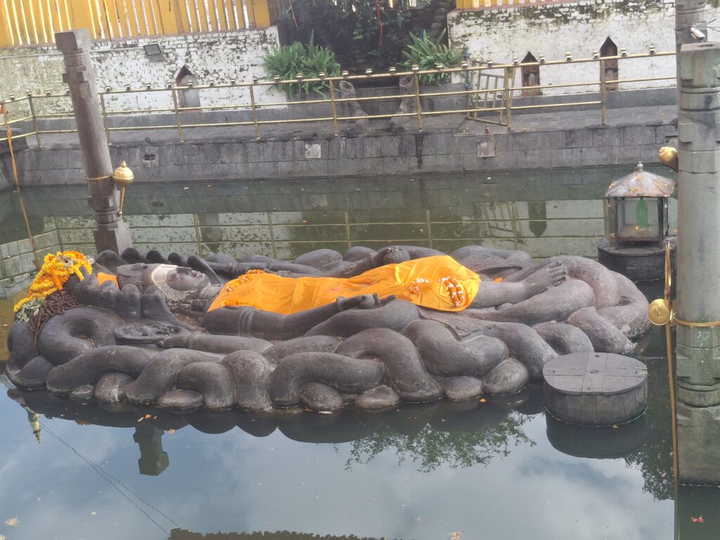 In the evening, we visited the Budhanilkantha temple, an interesting site where Bhagwan Vishnu is in the sleeping posture. Apparently, this is the only place in the world where you will find Vishnu sleeping flat on the surface of tangled nagas (snakes). In India, we have Lord Ranganatha in a reclining posture (Anantha Sayana) in temples like Srirangam, Thiruvananthapuram, Srirangapatna, and others. However, seeing Vishnu in this flat sleeping pose, that too in a pond within an open-air temple, was new to me.